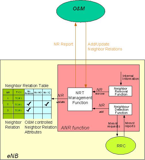 The ANR function resides in the eNB and manages the conceptual Neighbour Relation Table (NRT). Located within ANR, the Neighbour Detection Function finds new neighbours and adds them to the NRT. ANR also contains the Neighbour Removal Function which removes outdated NRs. The Neighbour Detection Function and the Neighbour Removal Function are implementation specific.