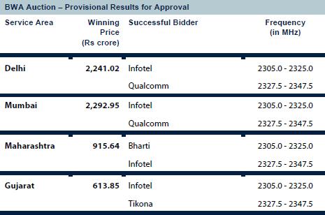 Internet Service Provider Infotel emerged as the only pan-India winner for BWA spectrum by committing Rs 12,872.52 crore. Aircel won spectrum in 8 circles.